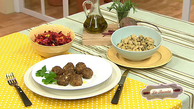Albóndigas, guarnición de legumbres y ensalada de remolacha