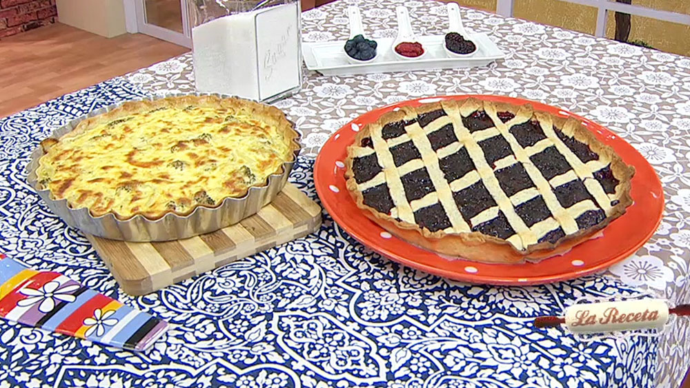Tarta de brócoli, zucchini y cebollas; pasta frolla de frutos rojos