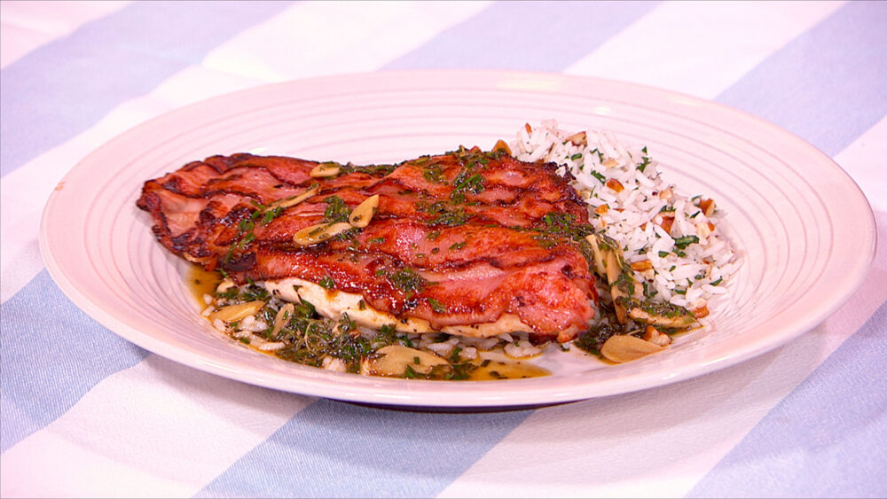 Pechuga de pollo aplastada con salsa de vino blanco y hierbas