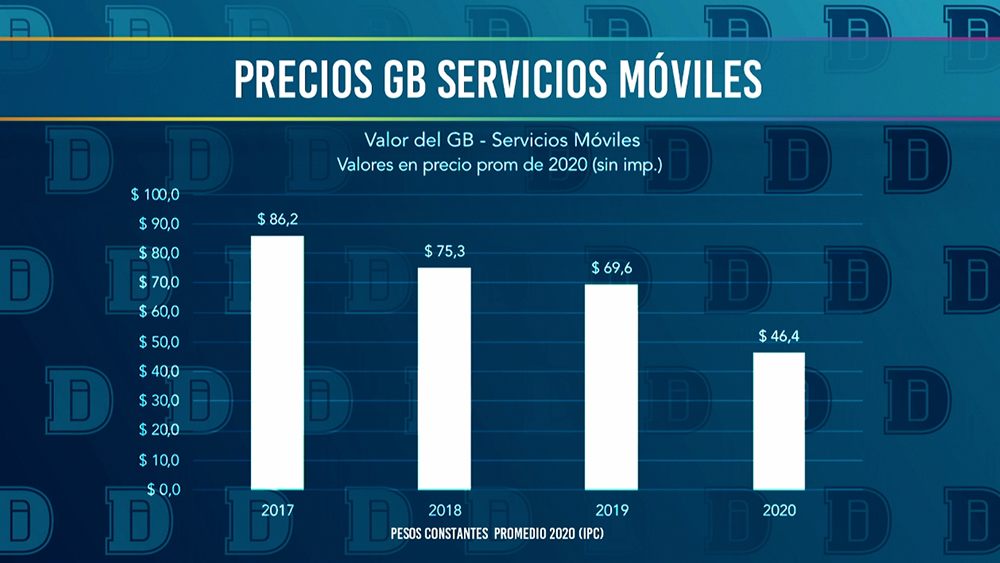 Hay una gama amplia de planes para que la gente encuentre el plan que mejor le sirva. Hicimos un esfuerzo muy grande en los precios. El componente más importante del consumo son los datos. El precio de lo que se paga en promedio por GB es lo más importante a analizar. En el 2020 el costo de GB se redujo de 5 pesos en términos nominales y reales. Se ve la caída del precio en términos constantes por IPC, pero también en términos reales. Esta es una baja del 26 %. Fue el año en el que tuvimos la reducción más importante. Lo mismo pasó para móviles y cayó un 33 % en términos reales. Los ajustes fueron por debajo de la inflación y en el 2020 se hizo muchas promociones y creció mucho el tráfico, por lo que el dinero rindió mucho más. Terminó pagando lo mismo por un uso mucho más intenso. Se ve el esfuerzo de la búsqueda de la tarifa. Se vio la reducción más importante en los últimos años.