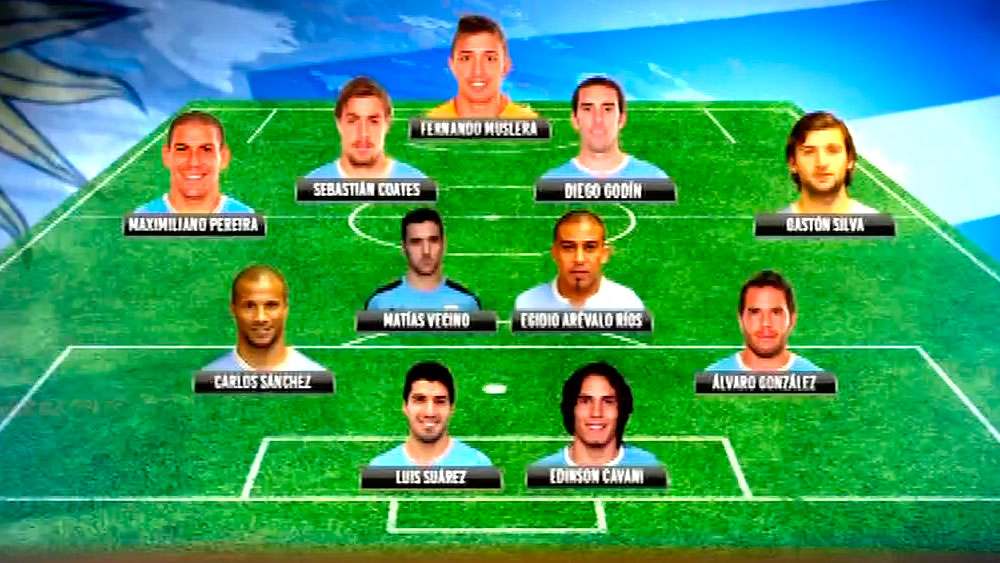 URUGUAY: Fernando Muslera, Maximiliano Pereira, Sebastián Coates, Diego Godín, Gastón Silva, Carlos Sánchez, Álvaro González, Egidio Arévalo Ríos, Matías Vecino, Edinson Cavani y Luis Suárez. DT: Óscar Tabárez.