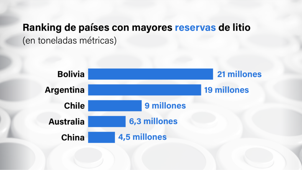 Pero si se mira dónde están las mayores reservas de litio, las miradas apuntan a América del Sur. Bolivia, Chile y Argentina son llamados el “triángulo del litio”.