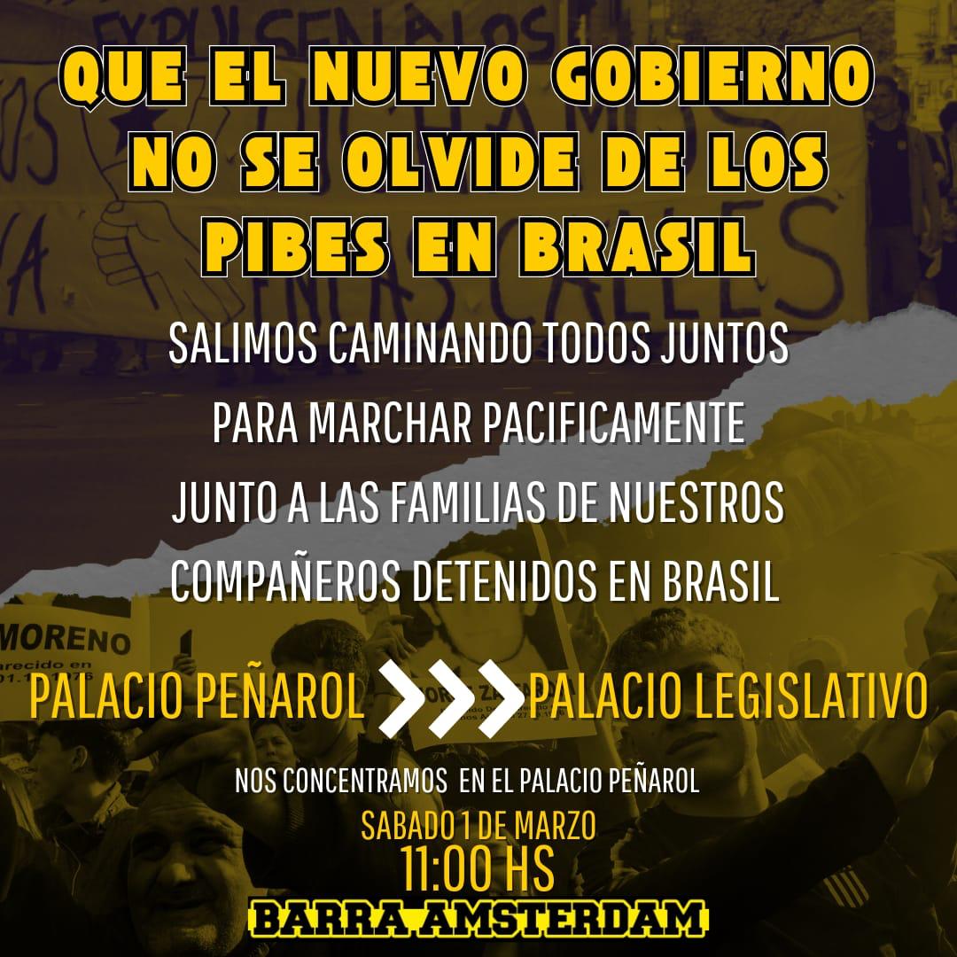 Familiares e hinchas de Peñarol marcharán este sábado desde el Palacio Peñarol al Palacio Legislativo "para que el nuevo gobierno no se olvide" de los hinchas carboneros que aún permanecen en Brasil desde el partido por Copa Libertadores ante Botafogo.