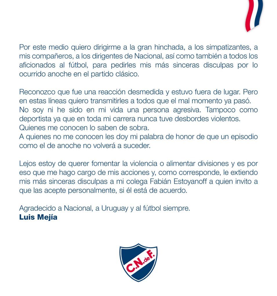 Tras lo sucedido, el jugador tricolor publicó una carta en su cuenta de Twitter.