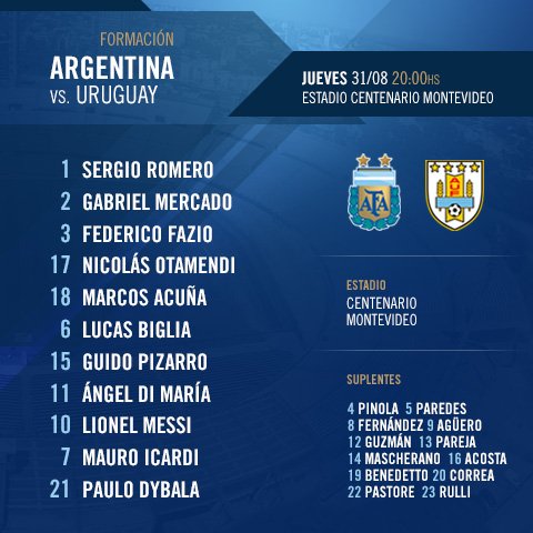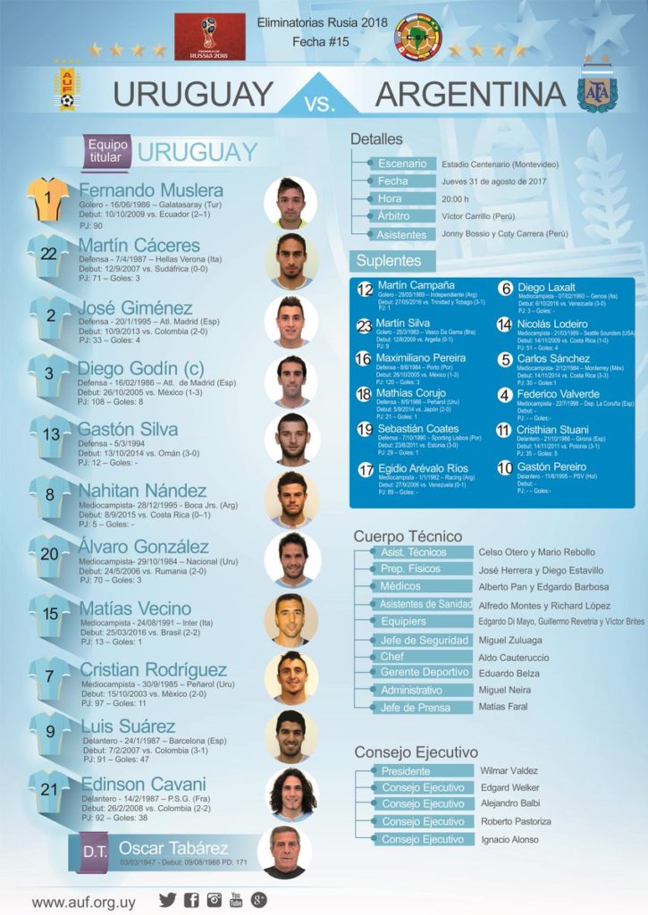 Uruguay y Argentina juegan por las eliminatorias de cara al Mundial de Rusia 2018 en el Estadio Centenario. El encuentro es dirigido por el árbitro peruano Víctor Carrillo.