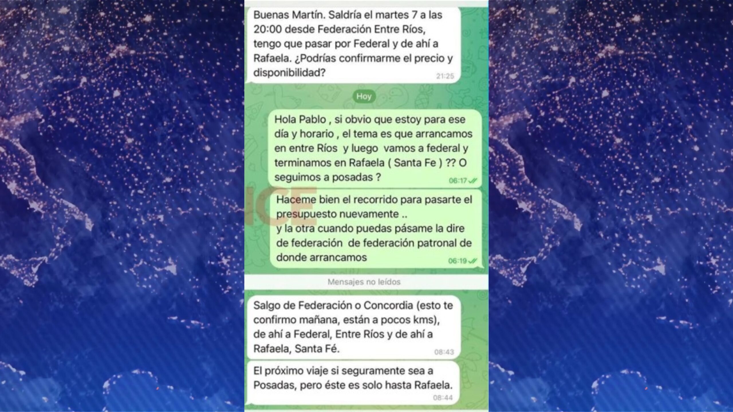 Palacio le respondió que estaba "para ese día y horario", pero que le pasara bien el recorrido así podía informarle cuánto salía el viaje. "Vamos a Federal y terminamos en Rafaela o seguimos a Posadas", consultó.
