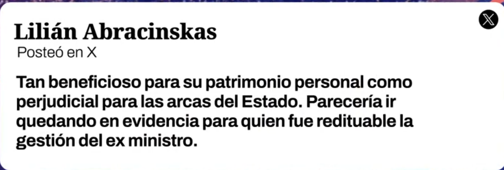 Abracinskas había citado un tuit del periodista Eduardo Preve en el que señalaba que García había aumentado su patrimonio entre 2019 y 2025 en un total de $16.6 millones. "Tan beneficioso para su patrimonio personal como perjudicial para las arcas del Estado. Parecería ir quedando en evidencia para quien fue redituable la gestión del ex ministro", escribió Abracinskas.