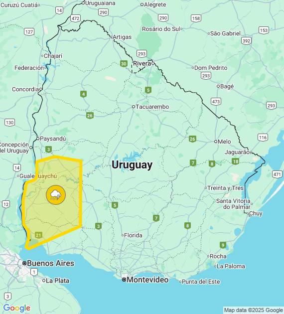 El Instituto Uruguayo de Meteorología (Inumet) emitió este jueves de mañana una advertencia amarilla por “tormentas puntualmente fuertes” para el oeste del país.