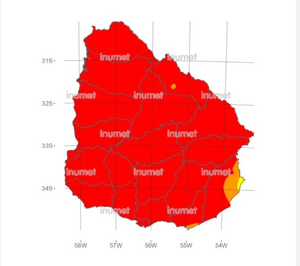 "Hay que extremar las precauciones y recordar que no se puede realizar fuegos al aire libre", indicó Bomberos en un mensaje en su cuenta de Twitter, en el que adjuntó un mapa de Uruguay casi completamente rojo, lo que indica que el riesgo de incendio es muy elevado.