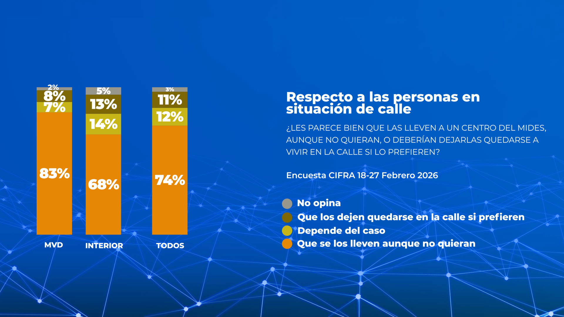 ¿Qué opina la población? 74% aprueba que se lleve a personas en situación de calle a un centro del Mides, incluso contra su voluntad, mientras que un 11% piensa que es mejor que los dejen quedarse a vivir en la calle si lo prefieren, según la última encuesta de Cifra. El apoyo a la internación compulsiva es 15 puntos porcentuales mayor en Montevideo que en el interior.