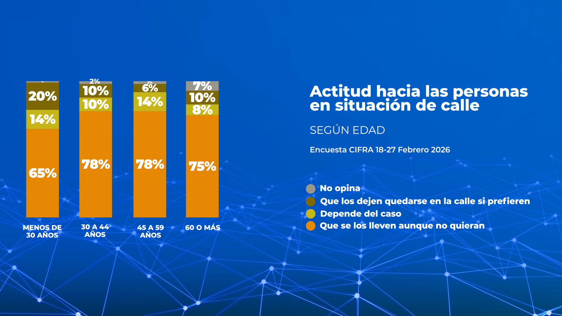 En el único grupo en el que se registra una minoría de peso (un quinto) a favor de dejar que la gente en situación de calle siga en la calle si lo prefiere es entre los más jóvenes. Sin embargo, incluso entre los jóvenes, la gran mayoría (dos tercios) apoya la internación compulsiva.