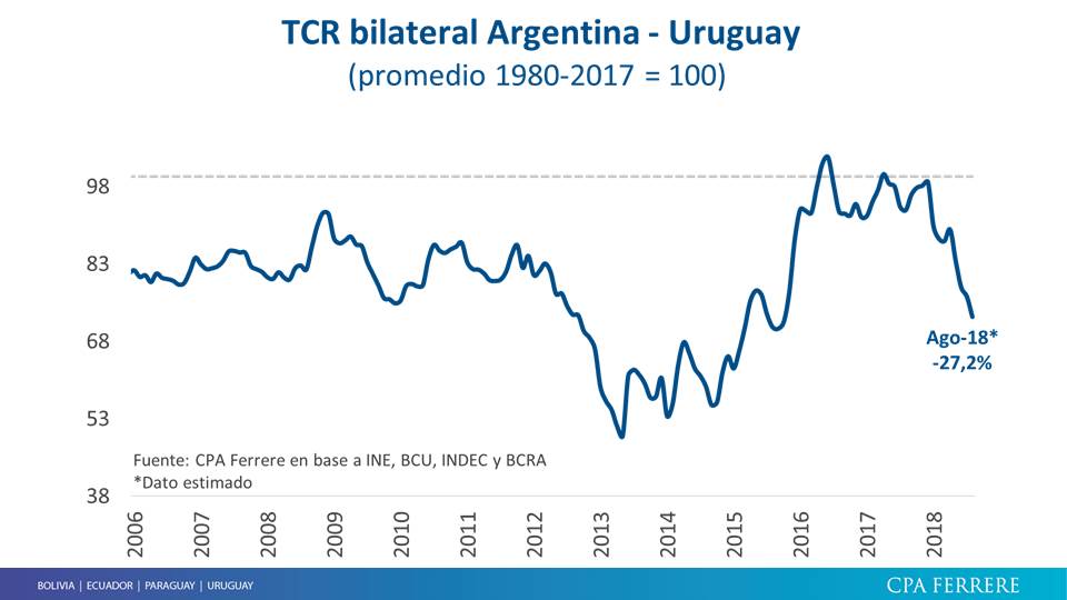 La siguiente gráfica muestra la relación de precios de Uruguay con Argentina: hasta hace unos meses estábamos en una situación de precios de equilibrio de largo plazo con Argentina, no estábamos ni caros ni baratos con respecto al país vecino. No obstante, la tendencia que ha tomado la gráfica desde enero a la fecha indica que hoy estamos un 30 % caros en dólares respecto del promedio histórico.
