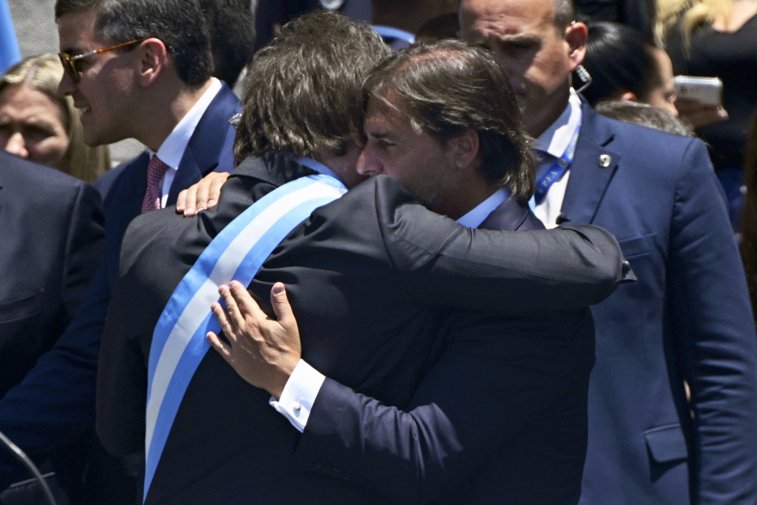 Luis Lacalle Pou saludó este domingo a su par argentino Javier Milei en la Casa Rosada tras su asunción como nuevo presidente de Argentina. Tras un estrecho abrazo, el presidente uruguayo le susurró algo al oído a Milei, a lo que éste respondió con un "sí".