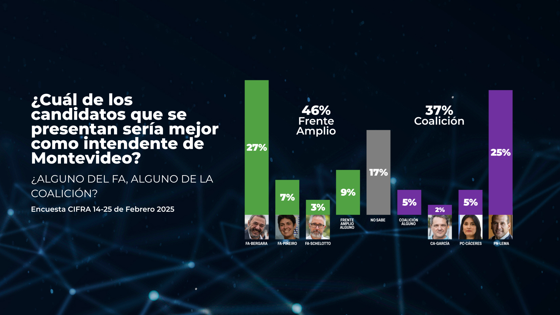 Ante la pregunta: "¿Cuál de los candidatos que se presentan sería mejor como Intendente de Montevideo?" se mencionaron los nombres de todos los líderes que se presentan. Mario Bergara (Frente Amplio) es preferido por el 27% y Martín Lema (Coalición Republicana) por el 25%.