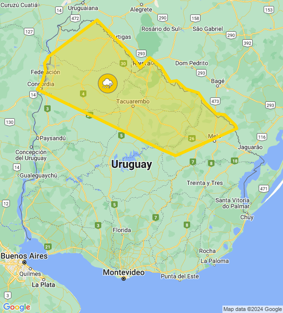 El Instituto Uruguayo de Meteorología (Inumet) emitió este viernes una alerta amarilla por "tormentas fuertes y lluvias intensas" para el norte del país