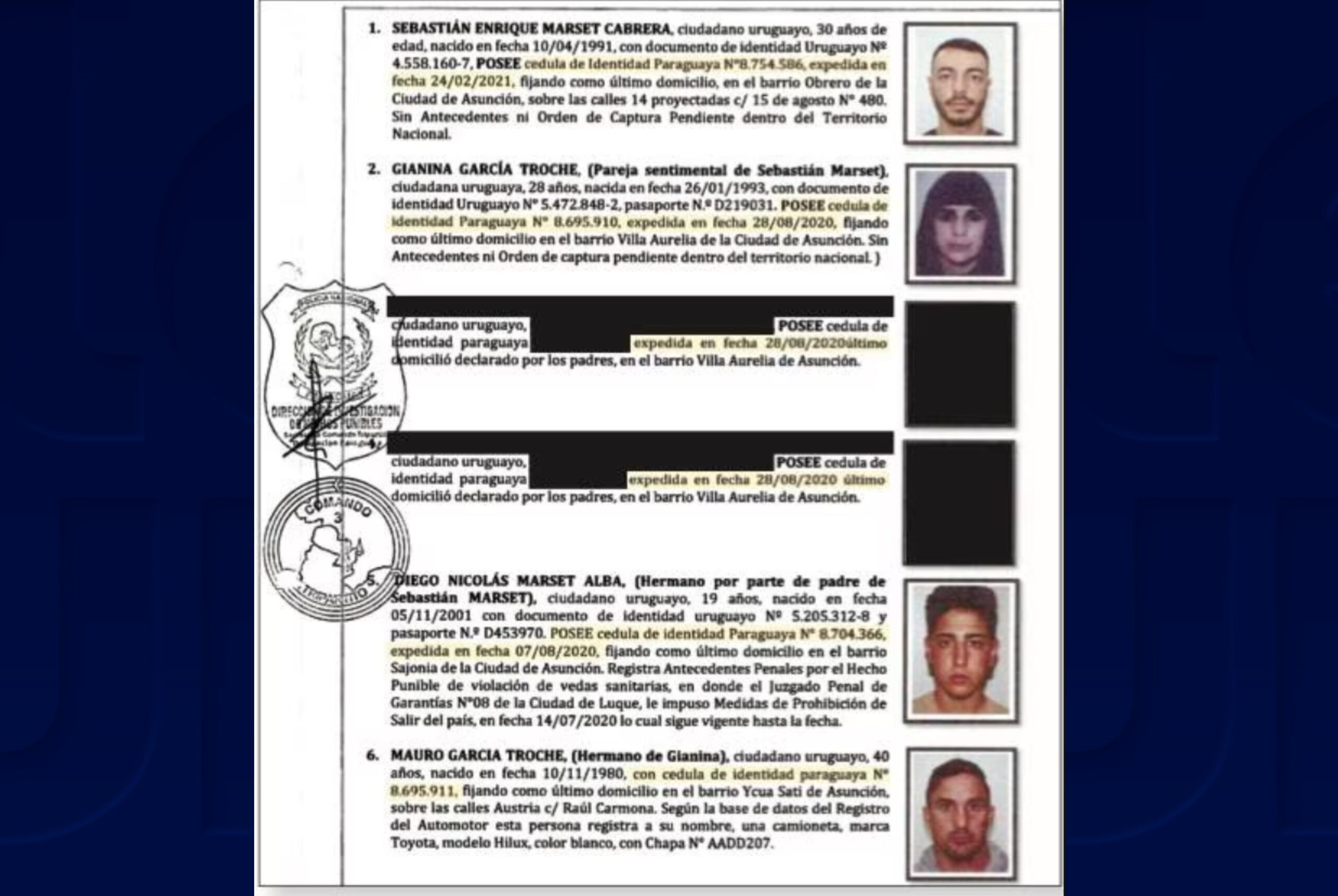Mauro García Troche es uruguayo y tiene 42 años. Según información policial a la que accedió el medio La Nación de Paraguay, la última residencia que se le conoce corresponde a una casa en el barrio Ycua Sati en la ciudad de Asunción.
