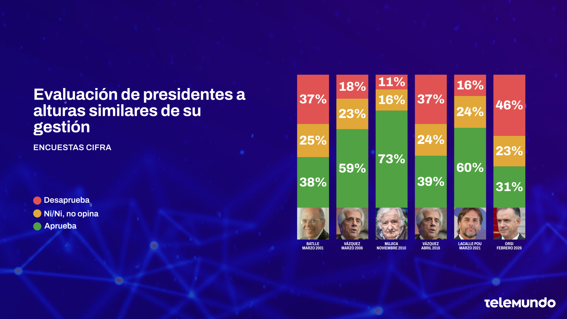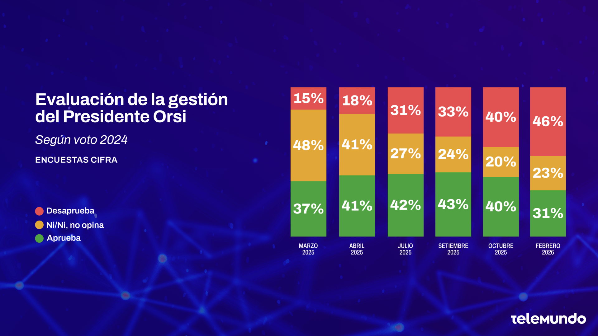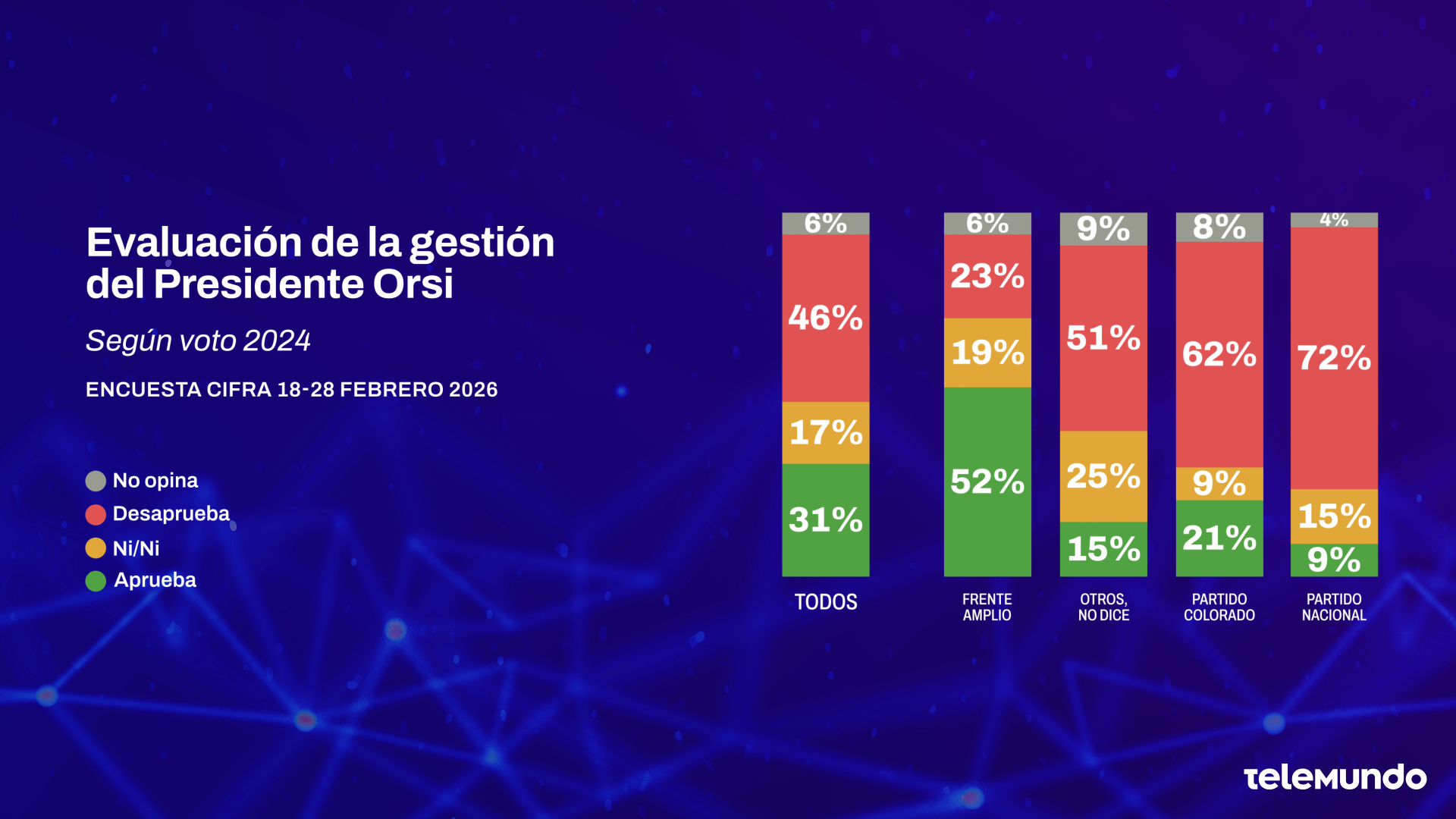 A un año de su asunción, el 31% aprueba el desempeño de Yamandú Orsi como presidente y el 46% lo desaprueba. Un 17% adicional ni aprueba ni desaprueba, y sólo 6% no tiene opinión.