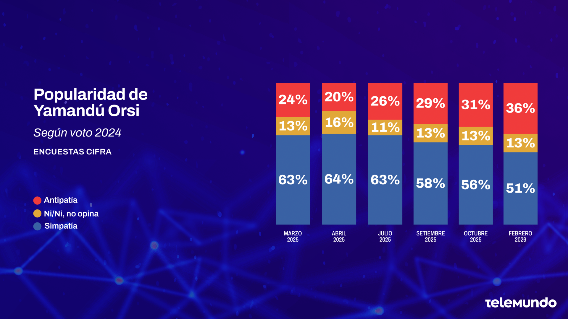 Sin embargo, también la popularidad del Presidente Orsi se ha visto afectada en los últimos 12 meses. El 63% simpatizaba con él hace un año, y esa simpatía se mantuvo hasta mediados de 2025. En setiembre ya se registró una caída que ahora se acentúa. Incluso teniendo en cuenta esa caída de popularidad, la imagen personal de Orsi continúa siendo un capital político.