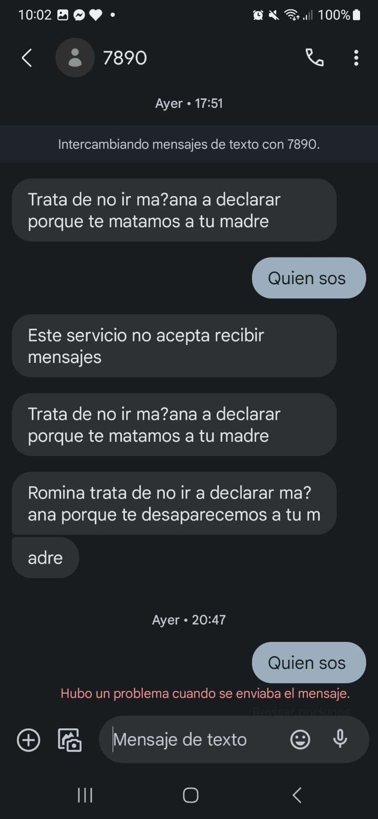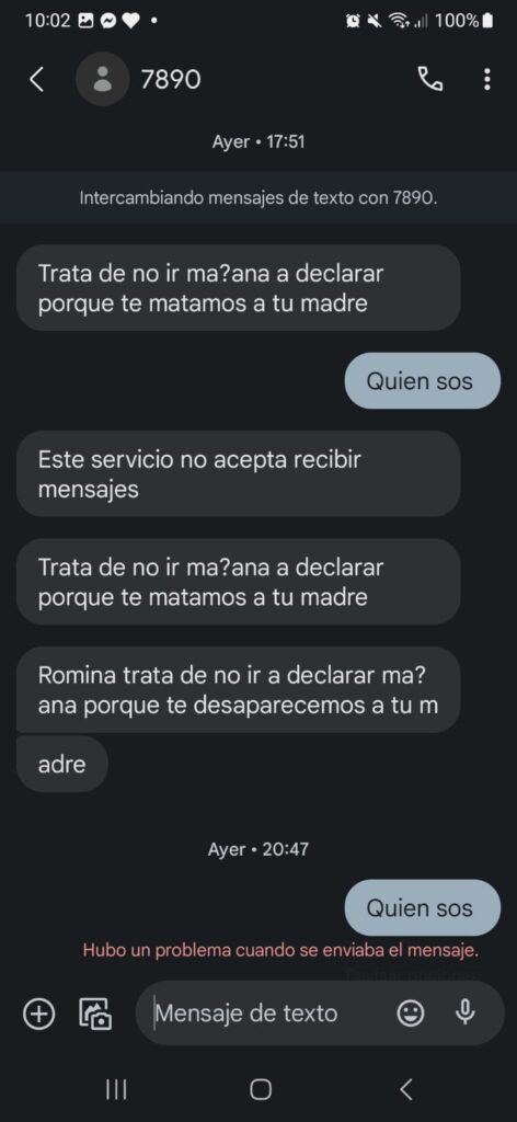 “Tratá de no ir mañana -este viernes- a declarar porque te matamos a tu madre”, dice uno de los mensajes.