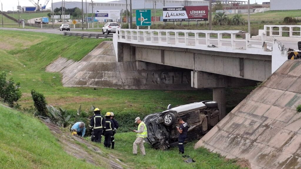 El auto, que circulaba hacia el norte del país, pegó contra el guardarraíl y la cabecera del puente y cayó a escasos metros del arroyo.