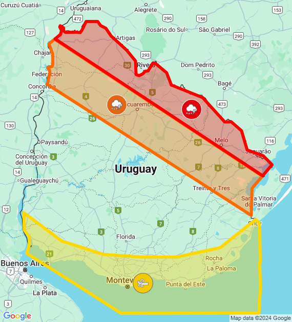 El Instituto Uruguayo de Meteorología (Inumet) emitió este domingo una alerta roja para la zona norte del país por tormentas fuertes y severas.