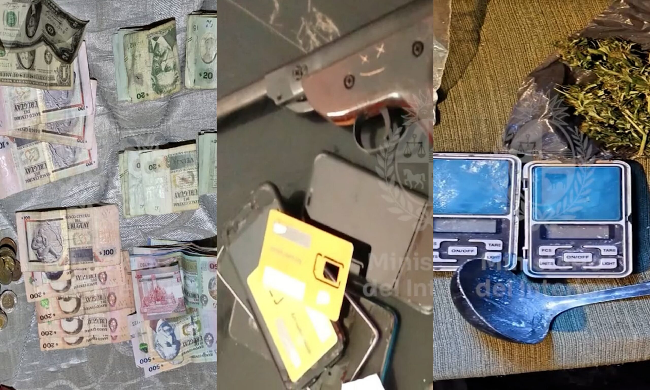 Con esto, se realizaron allanamientos en los departamentos de Montevideo, Colonia, Río Negro, Durazno y Canelones, y se detuvo a 38 personas. En total se hicieron 31 allanamientos, en los que se incautaron armas, municiones, vehículos, dinero y drogas, detallaron desde la Fiscalía.
